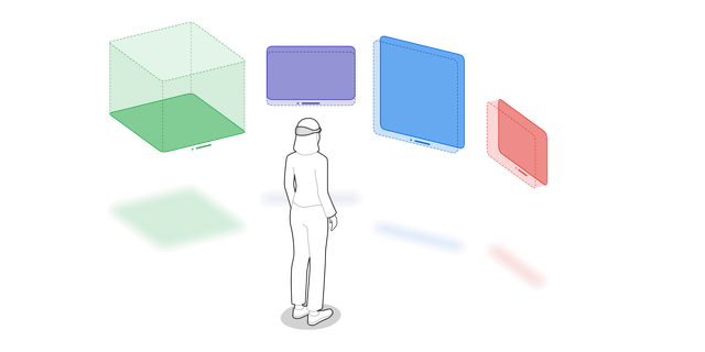 Content is no longer limited to 2D window containers. It can be placed in spatial containers that have volume, similar to 3D bounding boxes.