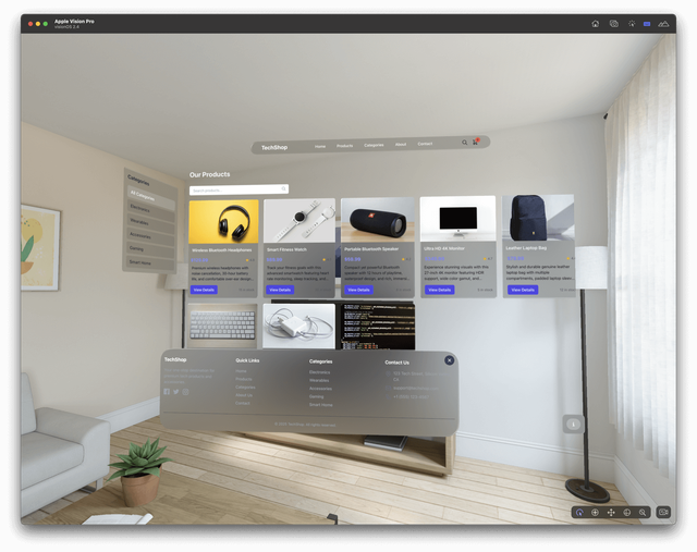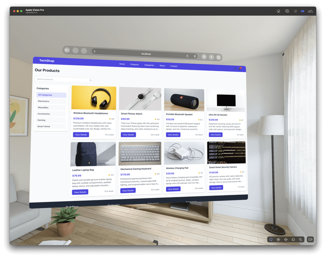 The screenshots below show how this sample project looks on different platforms. Only the last screenshot runs as a Packaged WebSpatial App on visionOS and activates spatialized UI. All other screenshots show the project running directly in regular browsers that do not support the WebSpatial API (including Safari on visionOS).